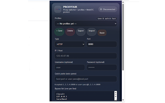 PROXYFAIR プロキシスイッチャーは、シームレスなプロキシ管理のために設計された無料の Chrome 拡張機能です。HTTP、HTTPS、SOCKS4、SOCKS5 を含むさまざまなプロキシタイプをサポートしており、ユーザーは数秒で安全に接続できます。主な機能には、プロキシプロファイルを保存、切り替え、インポート/エクスポートするためのプロファイルマネージャーや、簡単な接続設定のためのクイックプロキシペーストオプションが含まれています。さらに、この拡張機能は WebRTC 漏洩保護とユーザープライバシーを強化するためのバイパスリストを提供します。